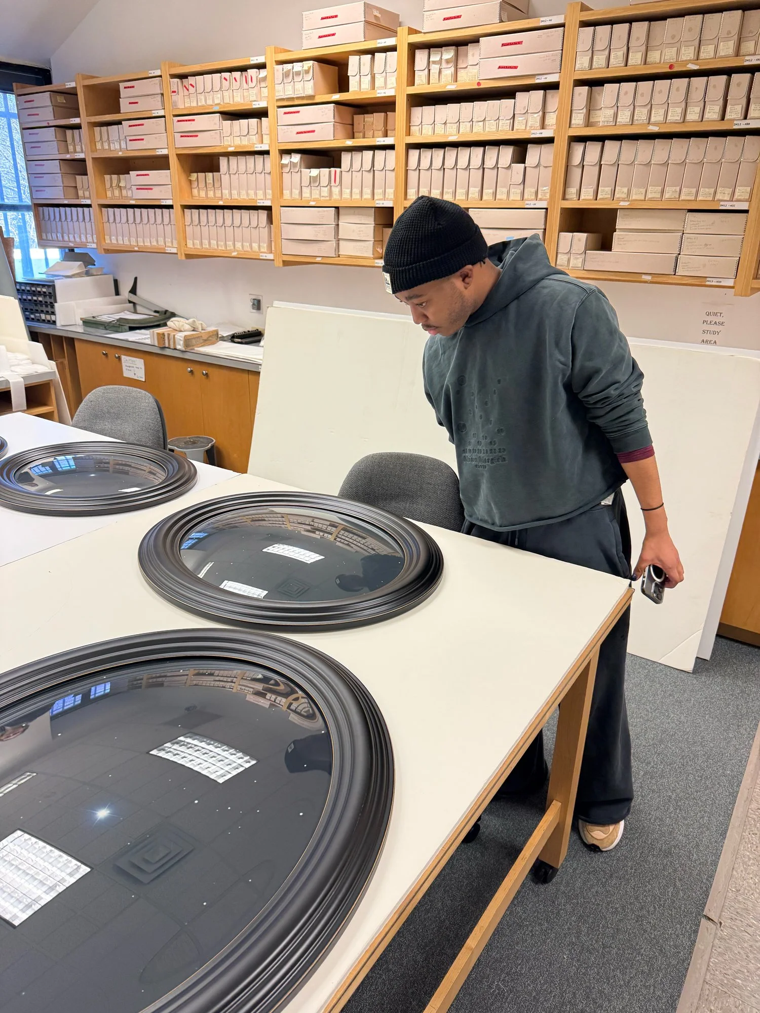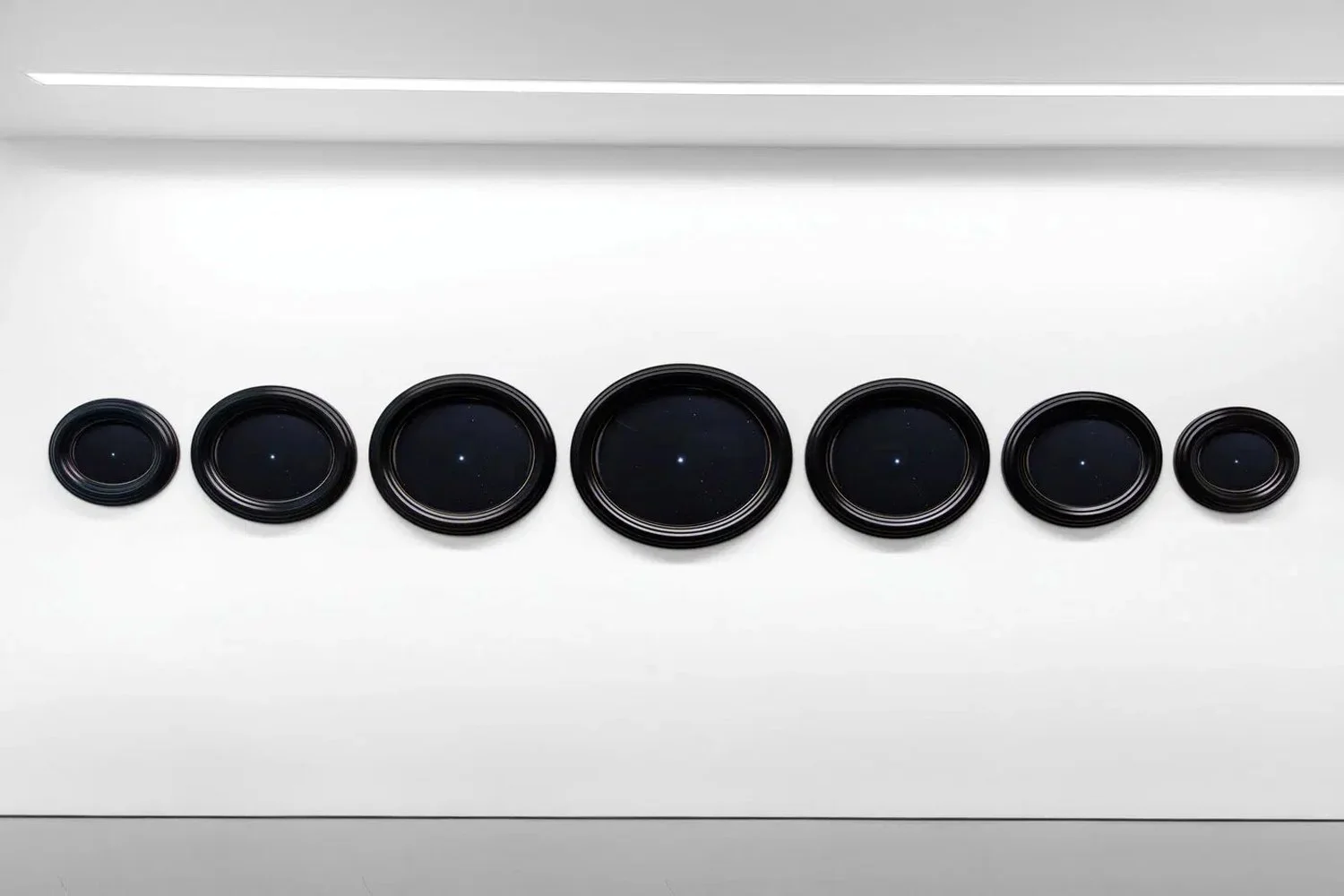 When arranged horizontally along a museum wall, this ensemble of images spans the length of the gallery and recalls a visual strategy that Weems used in earlier projects, such as Down Here Below, in which oval forms were aligned vertically. In The North Star, the images are framed by a convex lens that heightens the work’s speculative quality. Encountered in person, the piece draws the viewer in, as if looking through a telescope or standing inside a planetarium, with its deep black background and frame evoking the vastness of the night sky. The lens’s reflective surface intensifies this effect, functioning as a protective screen and as a black mirror in which viewers see themselves reflected. At the center of each image, the North Star remains fixed and luminous.