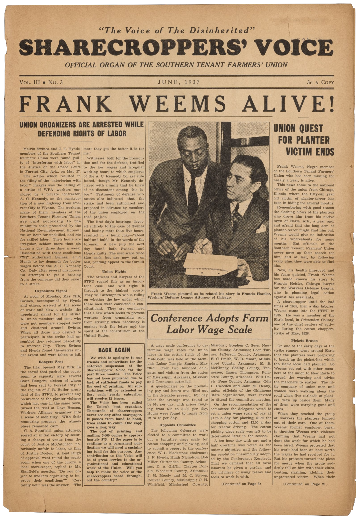 1. “Frank Weems Alive! Union Quest for Planter Victim Ends,” The Sharecroppers’ Voice, June 1937, 1-2;