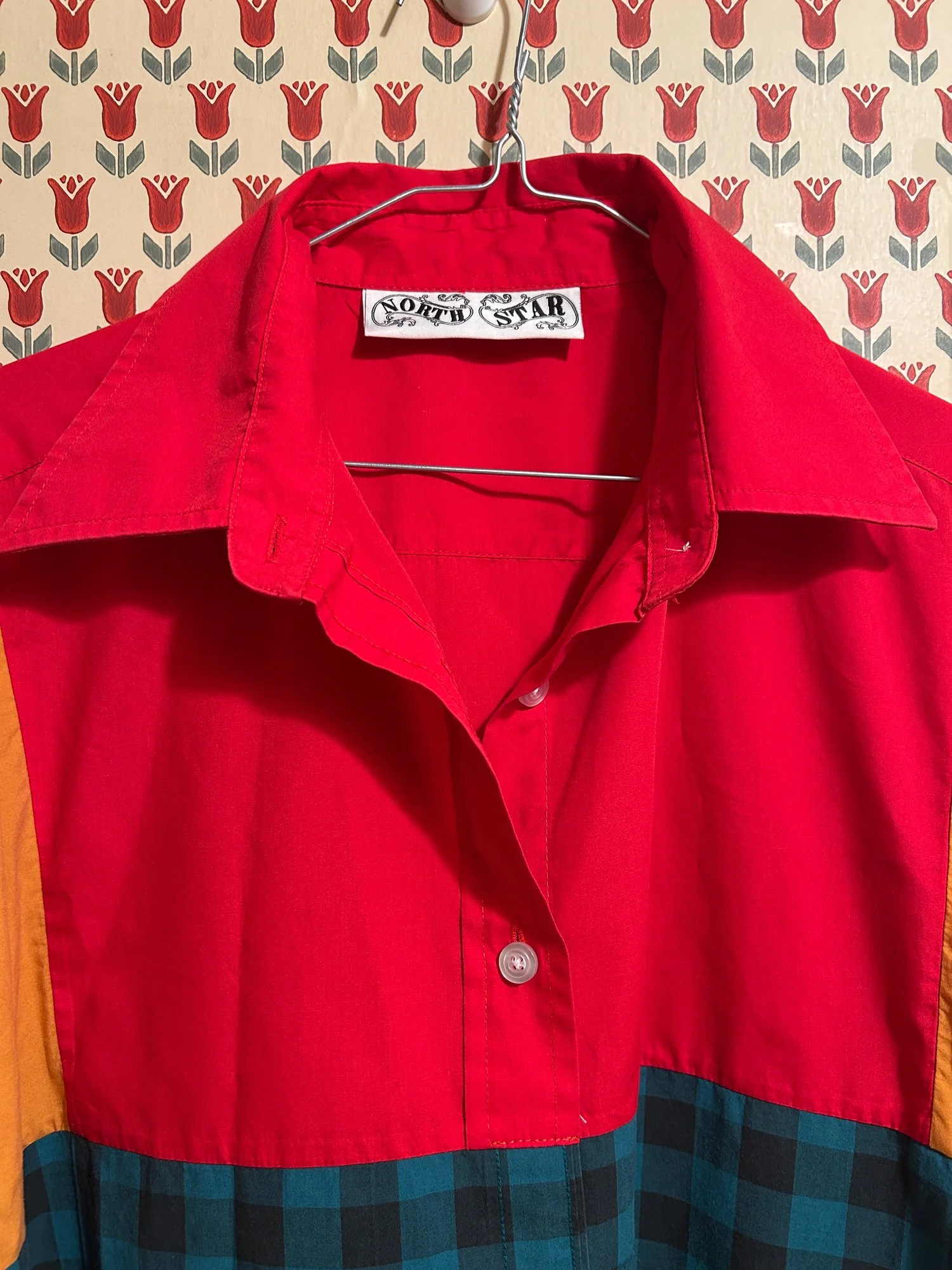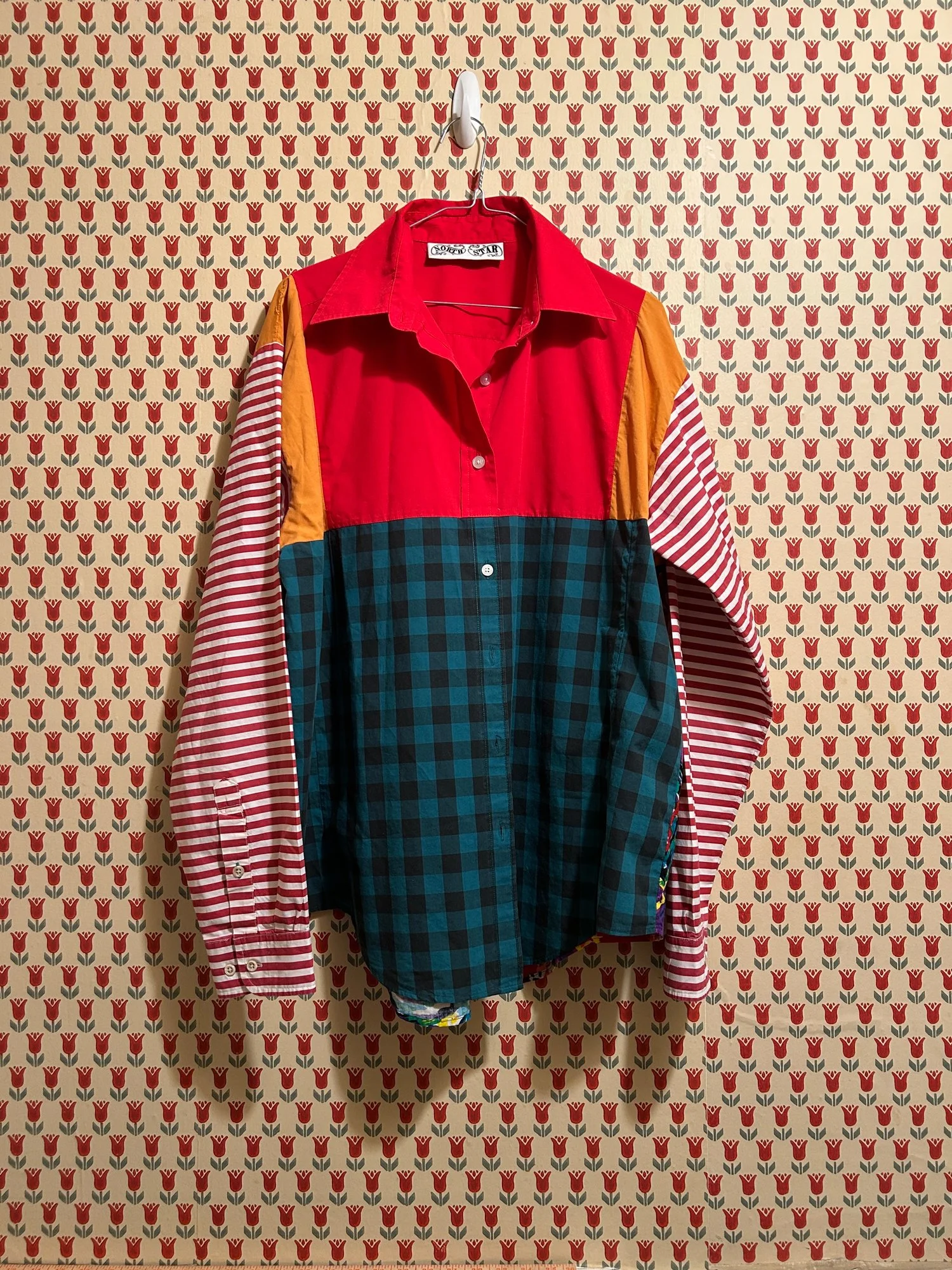 Not knowing what had been selected for me was thrilling, if slightly unnerving. When the parcel arrived weeks later, it contained a carefully wrapped shirt. What struck me first was its brightness. Red, yellow, red and white stripes, green and black checks—all patched together from thrifted shirts and deadstock fabric—jumped out at me. The intensity of this combination was jarring at first. It was not anything like my usual style, but I felt I could make it work. Then I turned the shirt around…