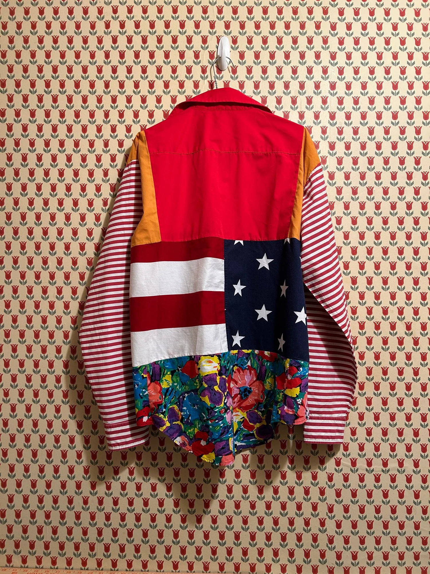 The back was similarly patchworked, but instead of green and black checks, it featured a floral fabric and a partial United States flag: red and white stripes alongside white stars printed on a dark blue background. Seeing this, I stopped. I put the shirt down and realized I could not wear it, even though I could not yet fully articulate why.